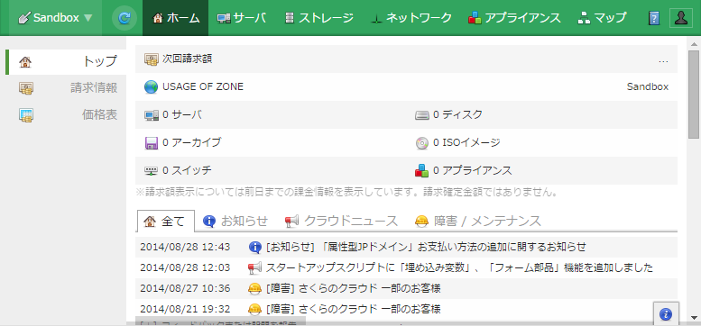 このゾーンでは課金を発生させずに、サーバやディスクの作成、ネットワーク構成など、サービス用ゾーンと同様の操作が行えます。