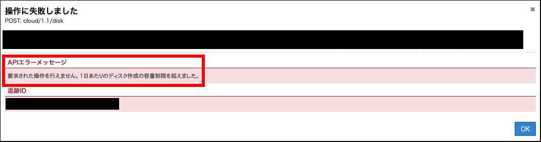 エラーメッセージが表示された場合はしばらく時間を置いていただくか、リソースの上限変更依頼にて制限が発生している旨をご連絡ください。