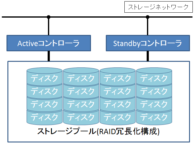HDDストレージでは、サービスを提供するコントローラを2台構成とし、それぞれがディスクを集積したストレージプールに接続されています。