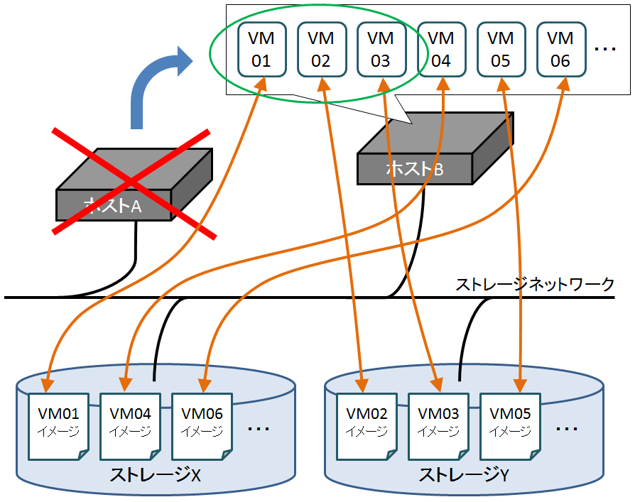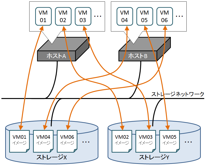 ホストサーバ側で起動されている仮想サーバに接続される仮想ディスクイメージは全てストレージ側に収容され、ストレージネットワークを介して読み書きされます。そのため、ホストサーバ側にはメモリ上の情報以外のデータは保持されません。