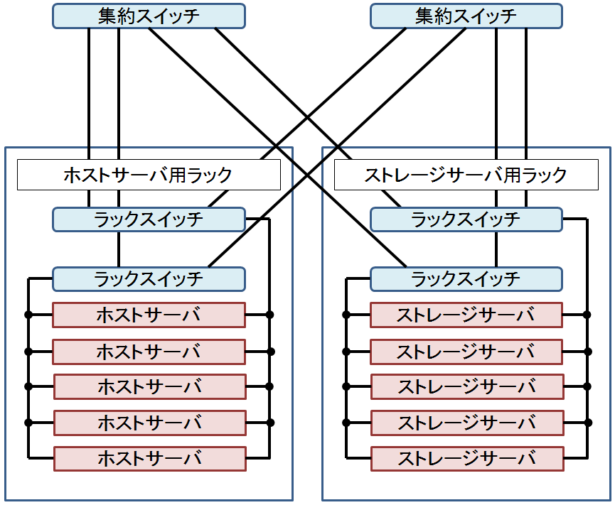 ストレージネットワークや、仮想サーバが外部と通信するネットワークなど、重要な経路はすべての回線・ネットワーク機器・インタフェース等が2重化されています。