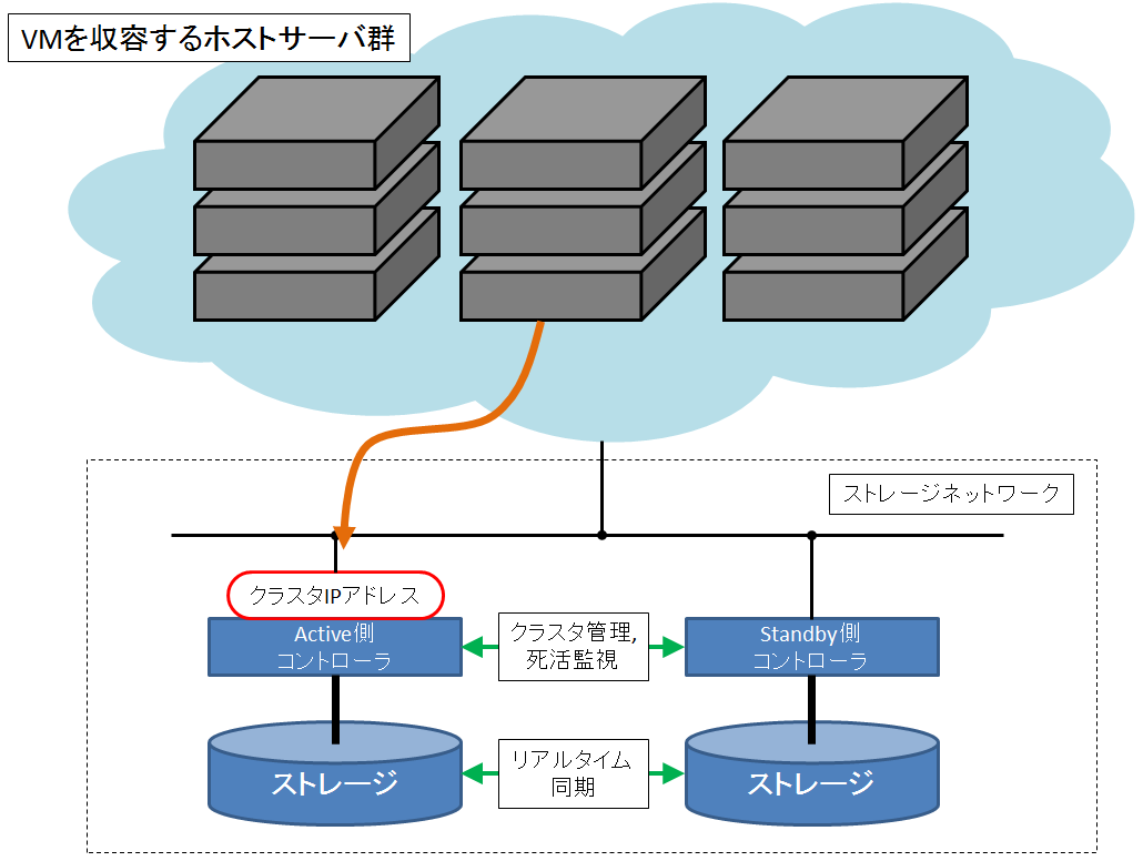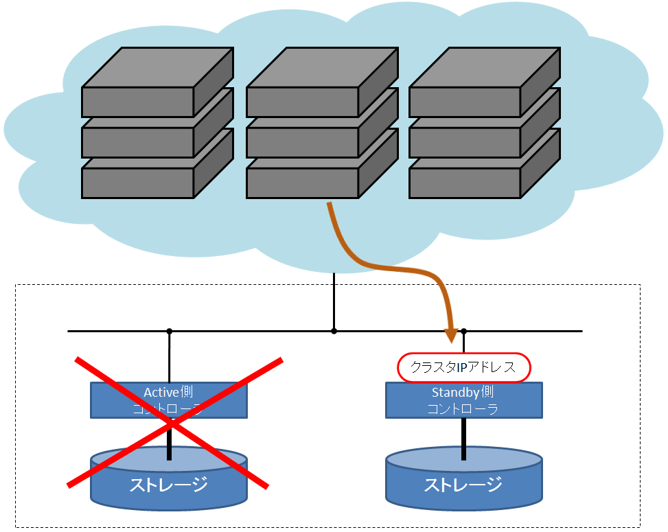通常時はアクティブ側の機器でサービスを継続しますが、異常が検知された場合は即座にスタンバイ側に切り替わり、ストレージアクセスが継続されます。