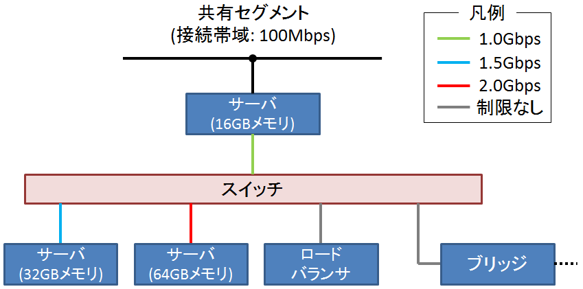・サーバ以外の機器や、ルータ部⇔スイッチ部の間は帯域の制限はありません。