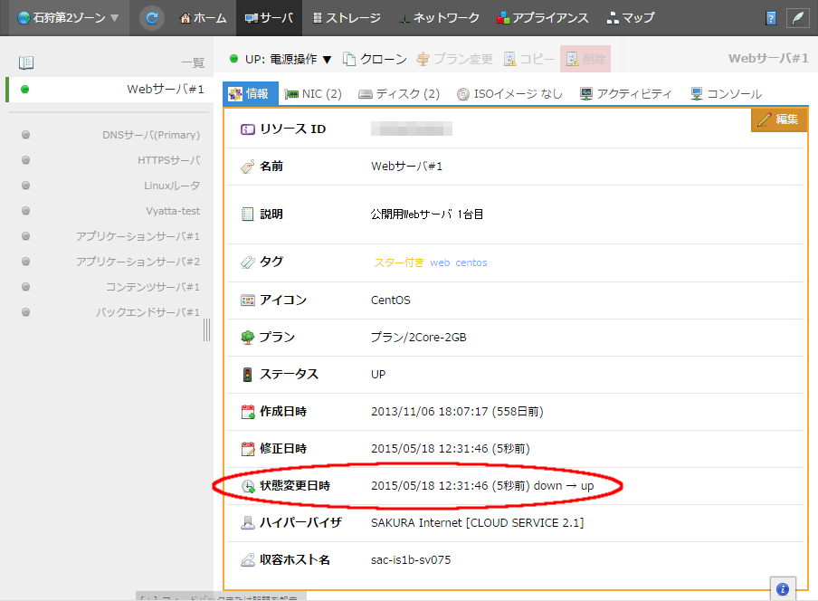 ※各サーバ/アプライアンスの起動開始時間は、コントロールパネル内サーバ/アプライアンス詳細画面の「状態変更日時」より確認ができます。