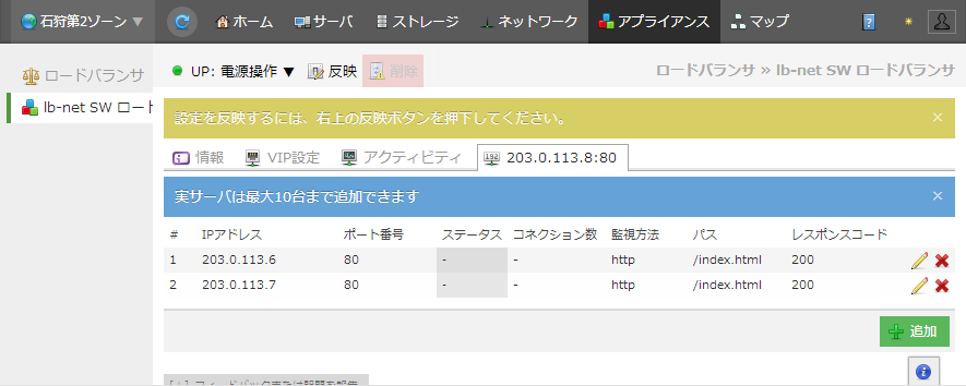 ※設定の追加、変更後は「反映」ボタンをクリックし、設定内容をロードバランサに反映する操作が必要です