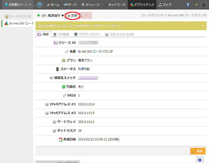 設定変更後は、必ず画面の「反映」ボタンをクリックし、ロードバランサ側に設定内容を反映させてください。