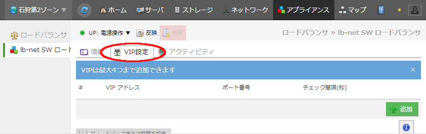 ロードバランサに仮想IPアドレスを設定します。ロードバランサ一覧画面で該当のロードバランサをダブルクリックし、「VIP設定」のタブをクリックします。