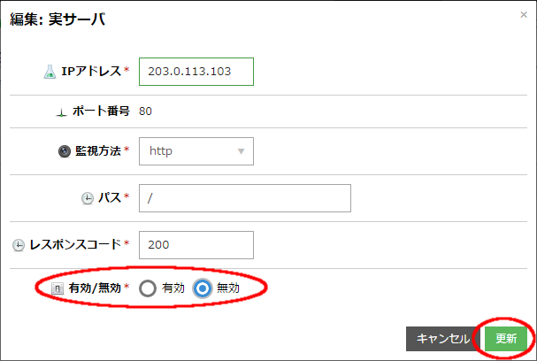 実サーバの設定情報編集画面が表示されるので、最下部の「有効/無効」ボタンいずれかを選択し、「更新」ボタンをクリックして閉じます。