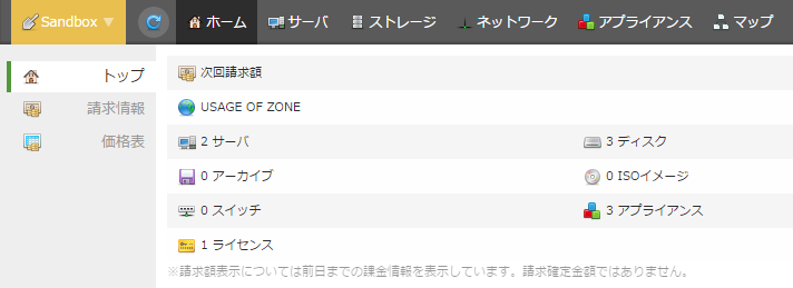 ※SandboxゾーンではコントロールパネルやAPIでの操作テストのための環境となるため、サーバやディスクの性能テストや、作成したサーバへのログインはできません。