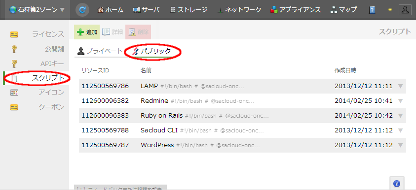 左側に表示されるサイドメニューより「スクリプト」をクリックします。スタートアップスクリプト管理画面が表示されるので、リスト画面上部の「パブリック」タブをクリックします。