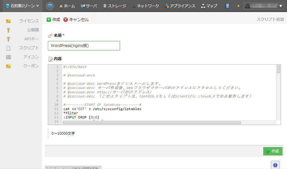 新規作成時と同様の画面が表示されるので「名前」欄と「内容」欄を編集し、「作成」ボタンをクリックするとプライベートスクリプトとして追加されます。