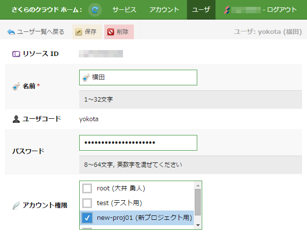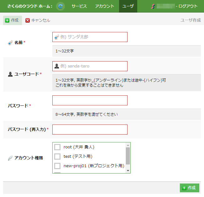 | アカウント権限 | 作成するユーザの操作を許可するアカウント(複数可)を選択します。 許可されたアカウントは、さくらのクラウドユーザとしてログインした際のアカウント選択画面に表示されます。 |