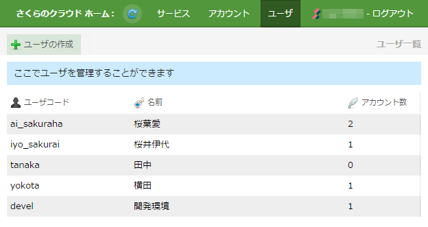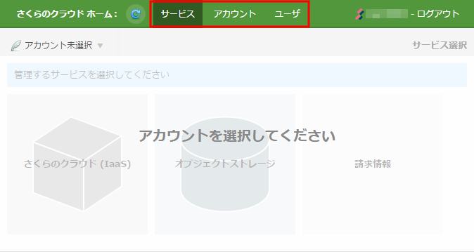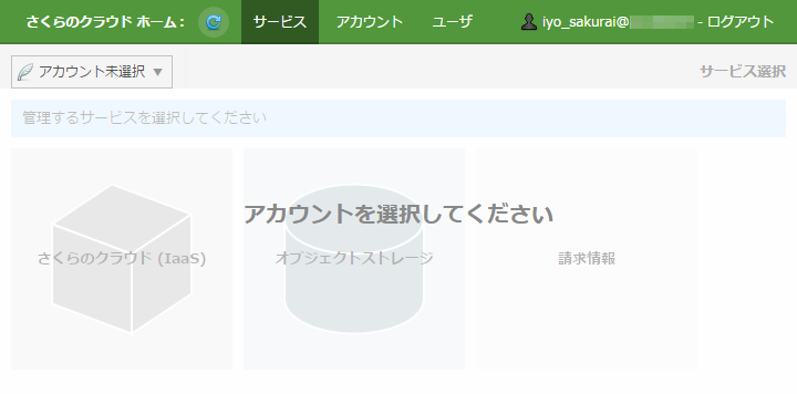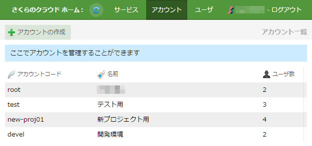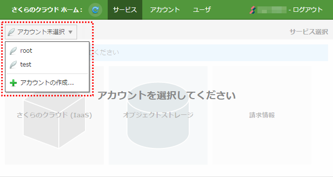 さくらインターネット会員としてログインした場合は「会員ID:アカウント名」が、さくらのクラウドユーザとしてログインした場合は「ユーザ名@会員ID:アカウント名」が表示されます。