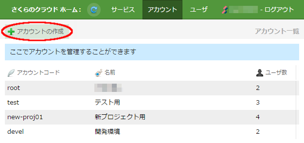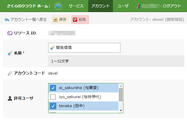 | 許可ユーザ | 作成するアカウントの操作を許可するユーザ(複数可)を選択します。 許可されたユーザは、さくらのクラウドユーザとしてログインした際のアカウント選択画面に表示されます。 |