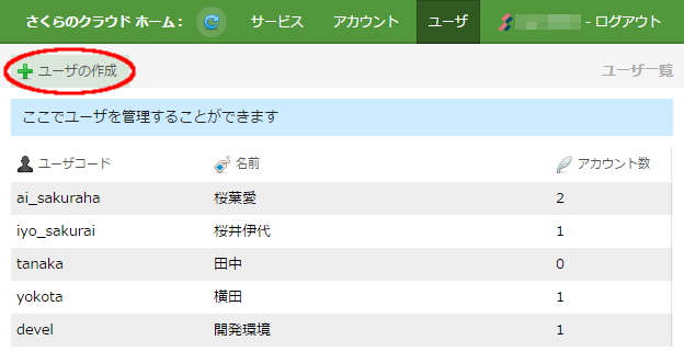 新規にユーザを作成する場合は、左上の「ユーザの作成」ボタンをクリックします。