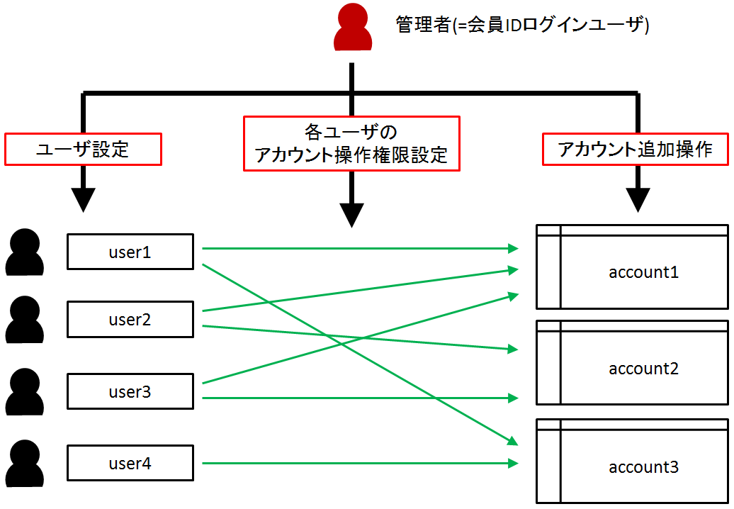 ・各ユーザのアカウントへのアクセス権限設定