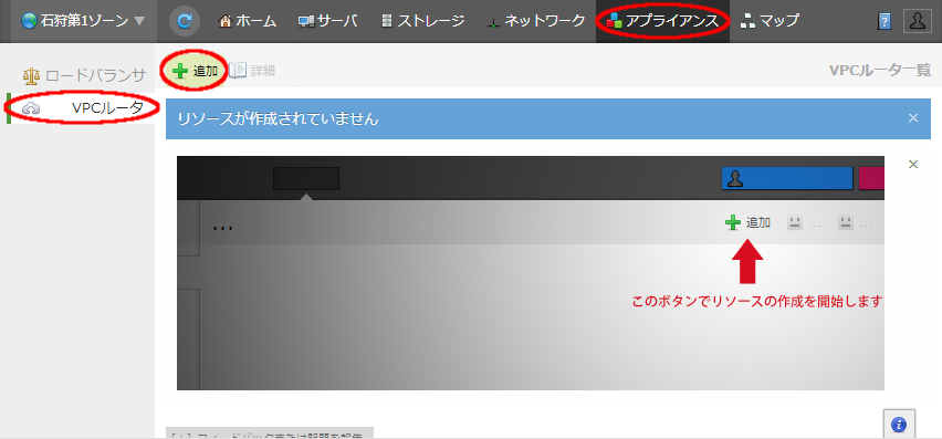 上部メインメニューより「ネットワーク」を選択し、左側のサイドメニューより「VPCルータ」を選択します。すでに作成済みのVPCルータが存在する場合はこの画面内にリストが表示されます。