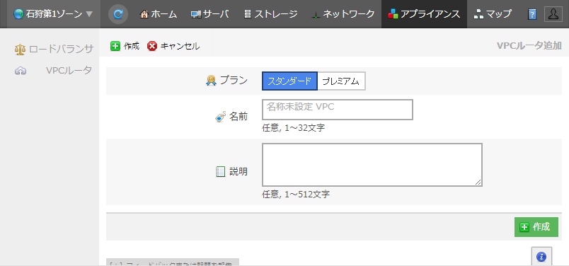 VPCルータの新規作成画面が表示されます。「プラン」の項目では、作成したいプランに応じ「スタンダード」、「プレミアム」のいずれかのボタンを選択します。