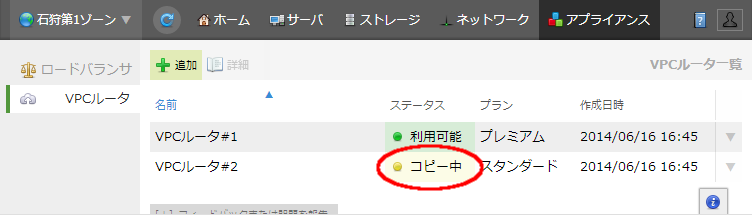 ※作成ボタンクリック後、VPCルータが利用可能状態になるまで数分程度かかります。下図のように一覧画面のステータス欄が「コピー中」の場合は完了までしばらくお待ちください。