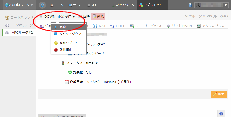 また、VPCルータの作成後はシャットダウンされた状態となります。シャットダウンされている場合は電源操作メニューより電源を投入し、VPCルータを起動します。