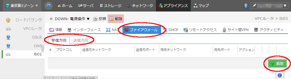 ファイアウォールルールの設定は、設定対象となるVPCルータの設定画面より「ファイアウォール」タブを選択することで行います。すでにルール設定が行われている場合、リスト画面に設定済みルールの一覧が表示されます。