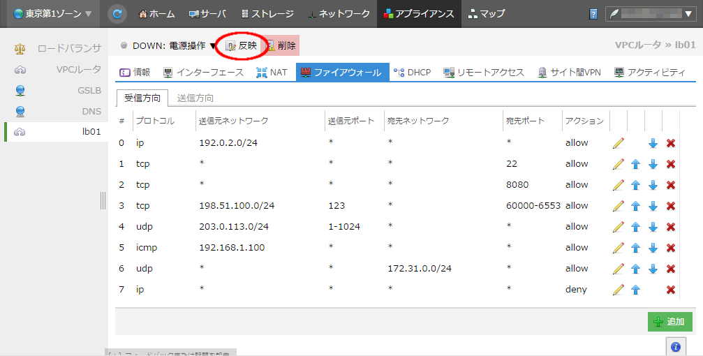 ※設定完了後、「反映」ボタンをクリックしVPCルータ側への設定反映が必要となります
