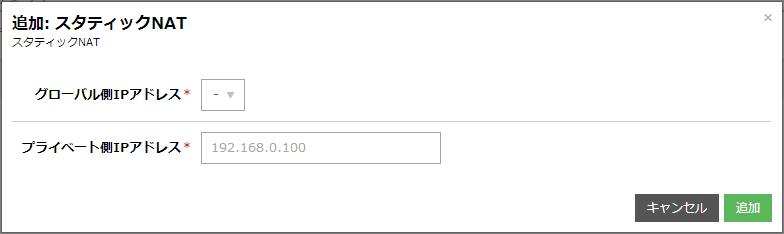 スタティックNAT追加設定画面が表示されるので、各設定項目に情報を入力します。