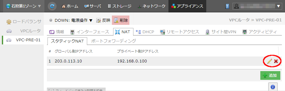 ※スタティックNAT設定の追加・変更・削除を行った場合、「反映」ボタンをクリックしVPCルータ側への設定反映が必要となります(VPCルータが起動状態の場合でも、電源をシャットダウンすることなく「反映」ボタンのクリックで設定が反映されます)。