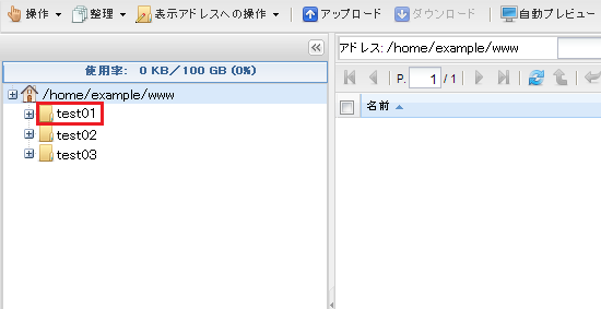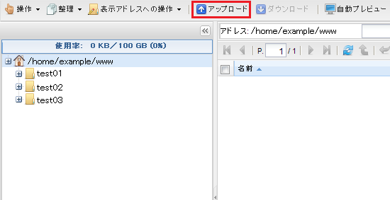 画面左のフォルダツリーから、ファイルをアップロードしたいフォルダをクリックします。