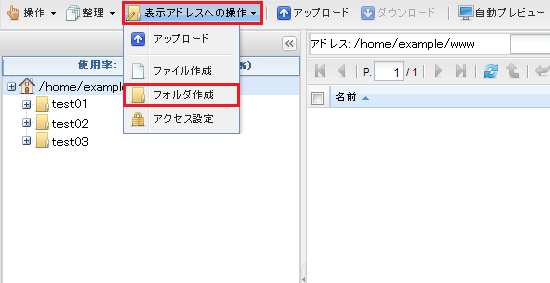 上部メニューの『表示アドレスの操作 』をクリックし、『フォルダ作成 』を選択します。