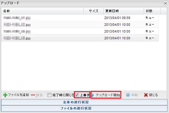 ファイルの更新(同名のファイルが存在する場合、上書き)を行う時は、『上書き』にチェックを入れ『 アップロード開始 』ボタンを押します。