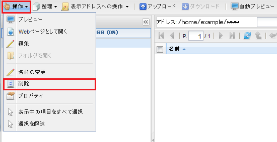 上部メニューの『操作 』をクリックし、『削除 』を選択します。