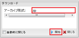 ダウンロード画面が表示されます。圧縮形式を指定し、『開始 』ボタンを押します。