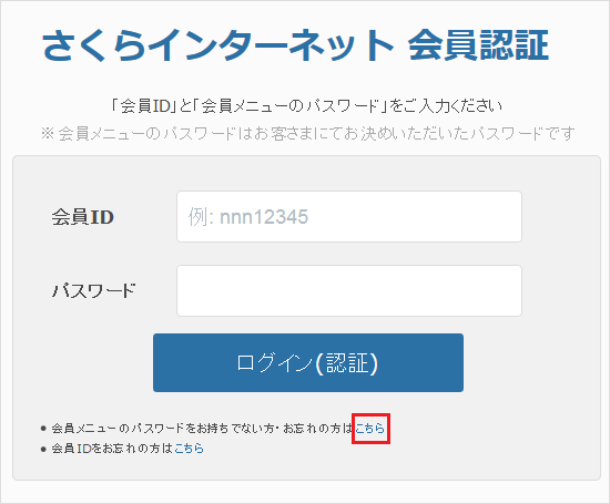 | パスワード | 会員メニューパスワード お申込み時に、お客様にて決めていただいた任意のパスワード 紛失された場合は「会員メニューパスワードの変更・再発行」をご確認ください。 |