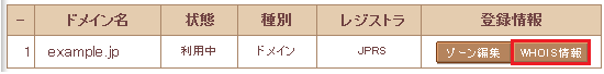 ドメイン名一覧から、公開情報を変更したいドメインの『 WHOIS情報 』をクリックします。