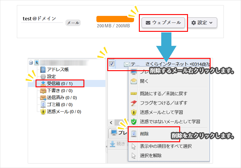 ウェブメールで不要なメールを削除して、容量を空けましょう 詳しいメールの削除方法はこちらをご確認ください。