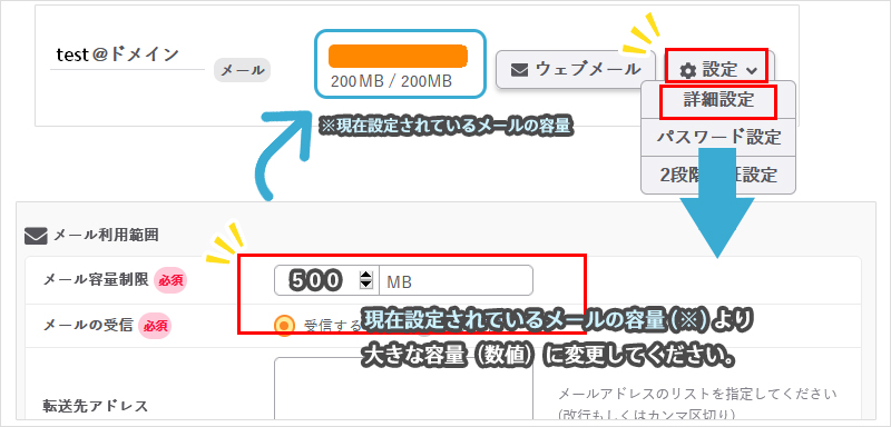 メールの容量の上限値を上げましょう ※大量のメールをサーバーに保存しておくと、サーバーの動作に影響を与える可能性がございます。不要なメールは定期的に削除していただくようお願いいたします。 詳しいメールの容量制限の変更方法はこちらをご確認ください。