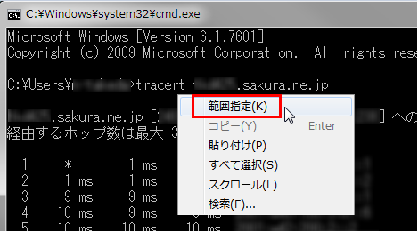 コマンドプロンプトのウィンドウ内で右クリックし、『 範囲指定(K)』をクリックします。