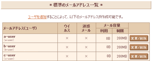 ユーザを追加した時点で、「 ユーザ名@標準のメールアドレスを利用できるドメイン 」で、メールアドレスを利用できます。