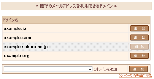 『 標準のメールアドレスを利用できるドメイン 』に表示されているドメインを確認します。