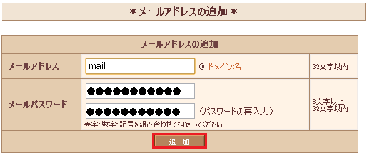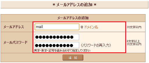 「 メールアドレスの追加 」から、作成したいメールアカウントを『 メールアドレス 』へ、メールパスワードを『 メールパスワード 』へ入力してください。