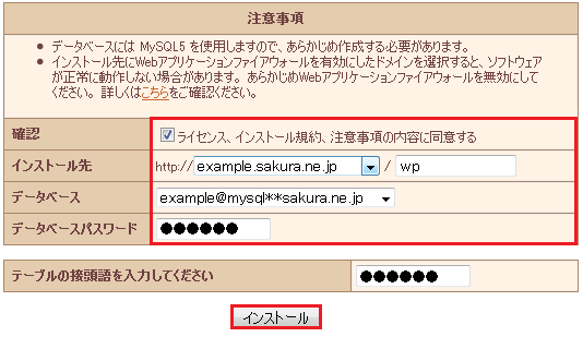 『データベースパスワード』『テーブルの接頭語』を入力のうえ『 インストール 』をクリックします。
