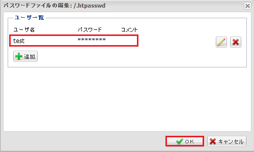 パスワードファイルの編集画面が表示されます。『 追加 』ボタンをクリックします。