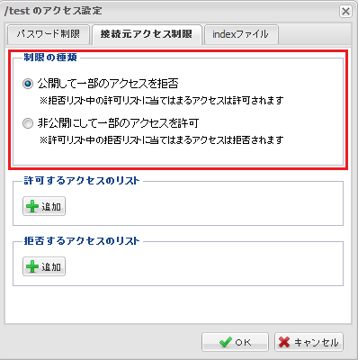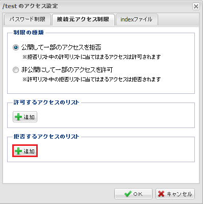 接続ホストやIPアドレスで制限をかけます。設定を行った下層フォルダに適用されます。
