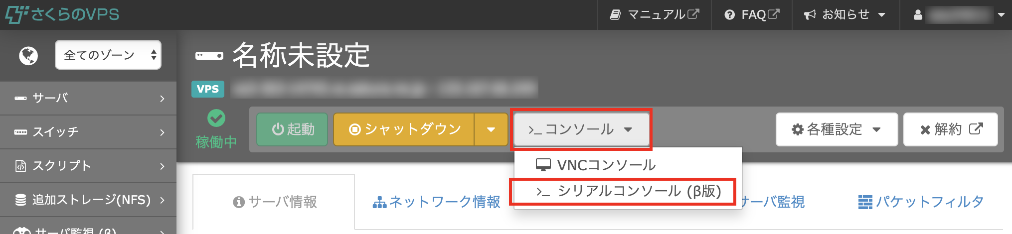 サーバを選択し、「コンソール」から「シリアルコンソール(β版)」をクリックします。