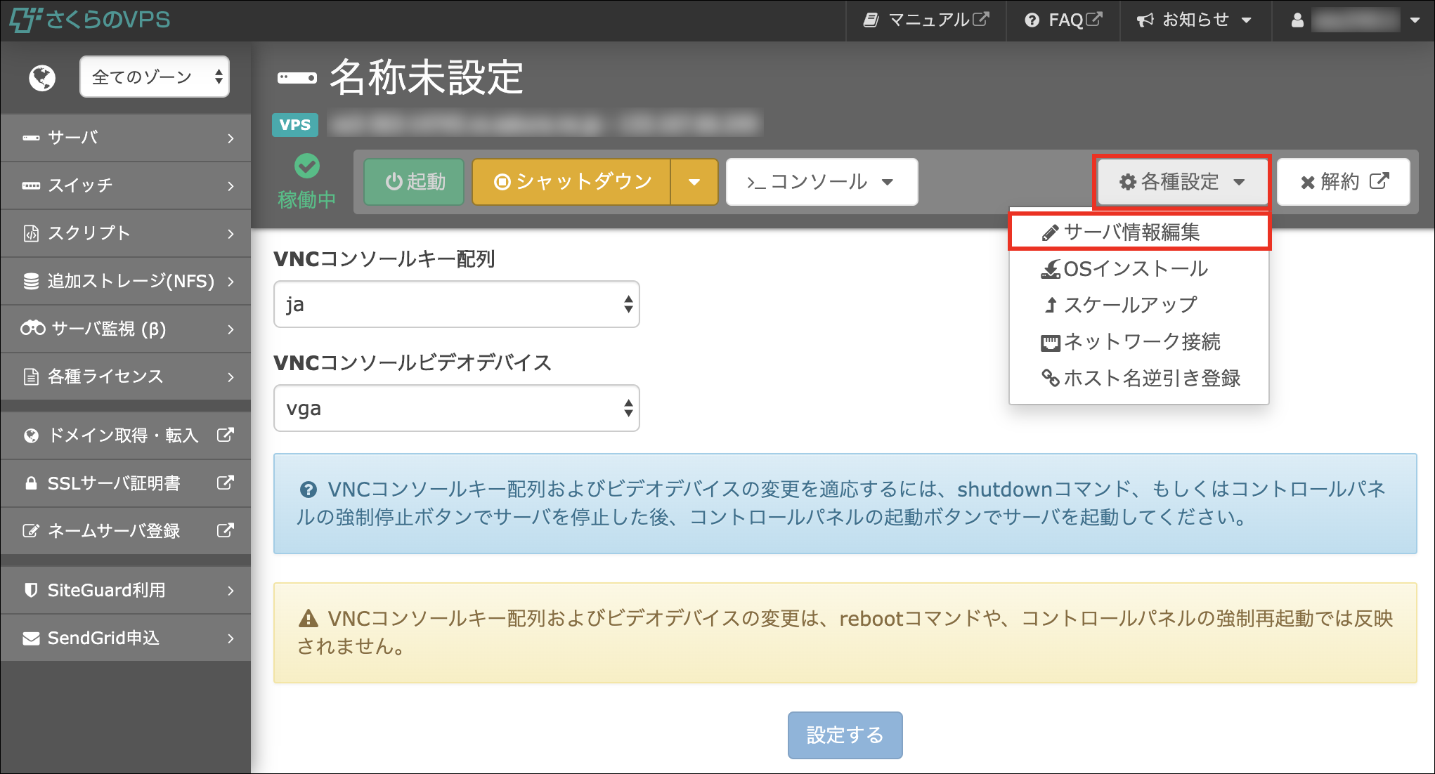 サーバを選択し、「各種設定」から「サーバ情報編集」をクリックします。