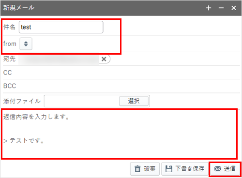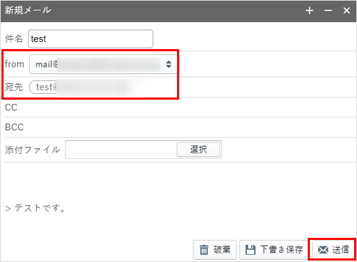 3[from]欄でメールアドレスを選択し、転送先を入力し、『送信』をクリックします。
