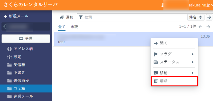メールを右クリックし、表示されるメニューから『削除 』を選択することでも、同様の操作が行えます。