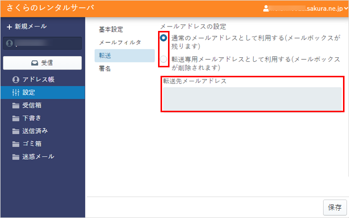 • 標準のメールアドレス (設定例:mail@example.sakura.ne.jp)