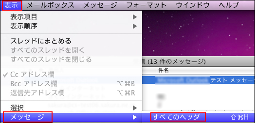 3上部の[表示]から『 メッセージ 』を選択し『 全てのヘッダ 』をクリックします。